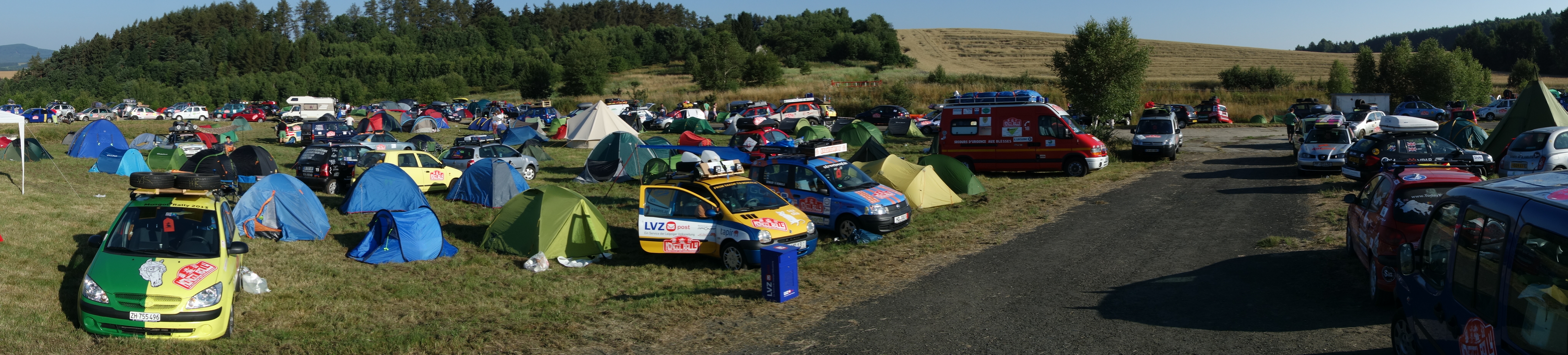 Nachdem wir am Sonntagmorgen alles verstaut hatten und unseren selbstgeplanten und selbstgezimmerten Stolz namens Dachträger beladen hatten, gings auch schon los. Türen zu, Motor an und ganz unspektakulär ging’s los Richtung München. Kurz vor der Grenze machten wir dann mal einen kurzen Stopp um einen Kaffee zu schlürfen. Und auf Anraten von einigen Personen in unserem Umfeld kontrollierten wir auch die Schrauben unseres Dachträgers. Doch wir können besorgte Leute entwarnen, allen Unkenrufen entgegen hatte sich bis dahin keine Schraube gelöst, denn was nicht ist, kann sich auch nicht lösen. Hatten wir doch prompt vergessen eine wichtige wieder einzusetzen und festzuziehen nach dem Beladeprozedere. Naja, nochmals Glück gehabt, ist nichts passiert, keine Kiste und kein Tisch auf der Fahrbahn hinter uns, aber wir haben unsere Checkliste fürs Beladen mit dem Punkt „Schraube einsetzen“ erweitert. Nach diesem kleinen Malheur hiess es dann Gaspedal an den Anschlag und rauf auf die deutsche Autobahn. Und siehe da, unser kleiner Getz schafft doch nach einer Beschleunigungsphase von ca. 10min stattliche 150 bis 160 Kilometer in der Stunde. So bretterten wir dann Richtung Tschechien, jedoch nicht ohne unserem neuen Hobby zu frönen, dem Tanken. Mit einer Tankladung schaffen wir nur gerade 450 Kilometer, dann ist auch schon wieder Ende Feuer. Mit leerem Tank trafen wir dann schliesslich einen Tag zu früh bei der Czech-Out Party ein. Als Team Nummer drei. Nachdem die Zelte aufgebaut waren und ungefähr 2000 Moskitos gutgenährt von Dannen zogen war es dann auch für uns Zeit.